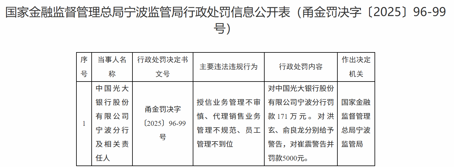 10月17日,国家金融监督管理总局宁波监管局行政处罚信息公开表显示,中国光大银行股份有限公司宁波分行及相关责任人因授信业务管理不审慎、代理销售业务管理不规范、员工管理不到位被罚款171万元。对洪某、俞某龙分别给予警告,对崔某警告并罚款5000元。